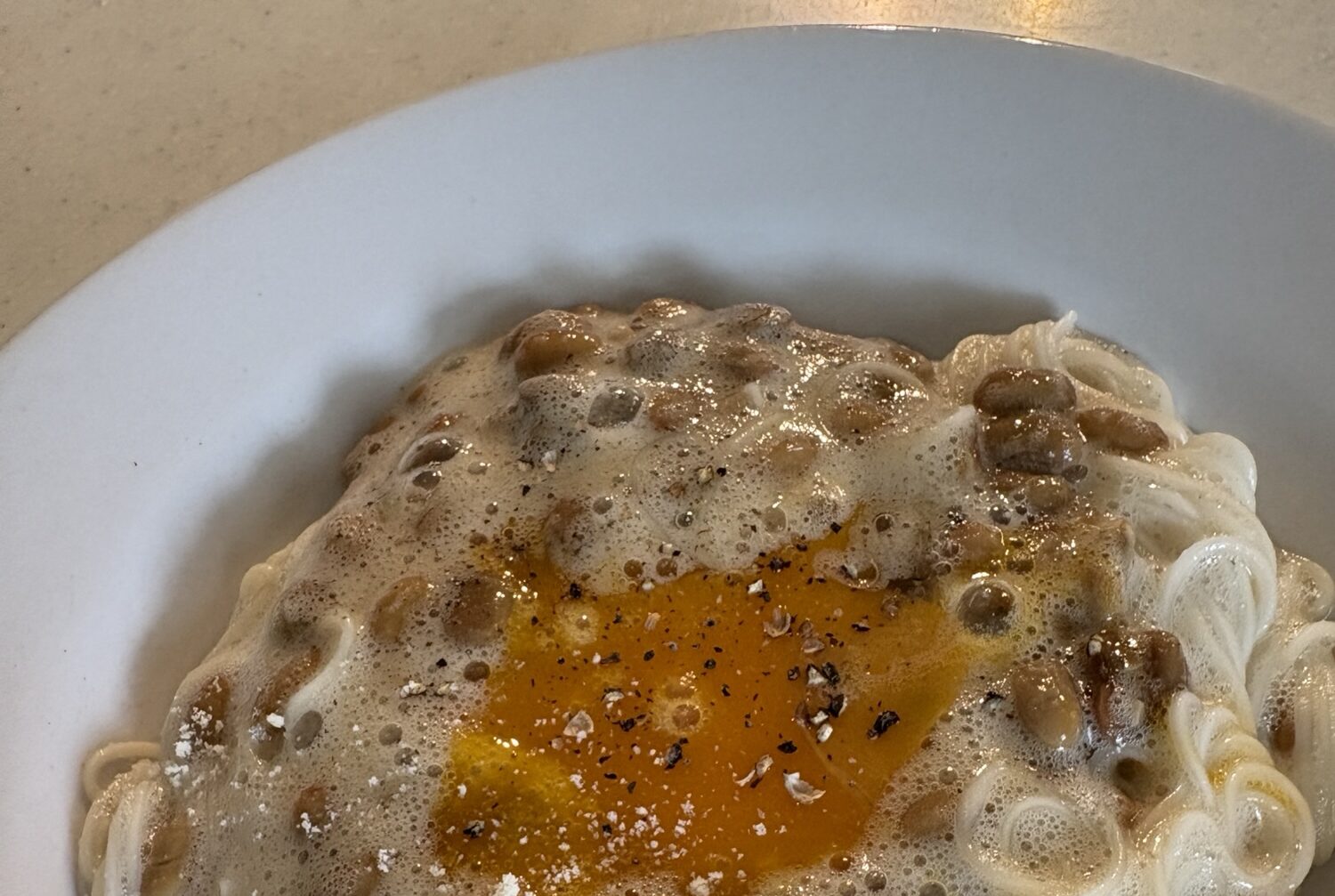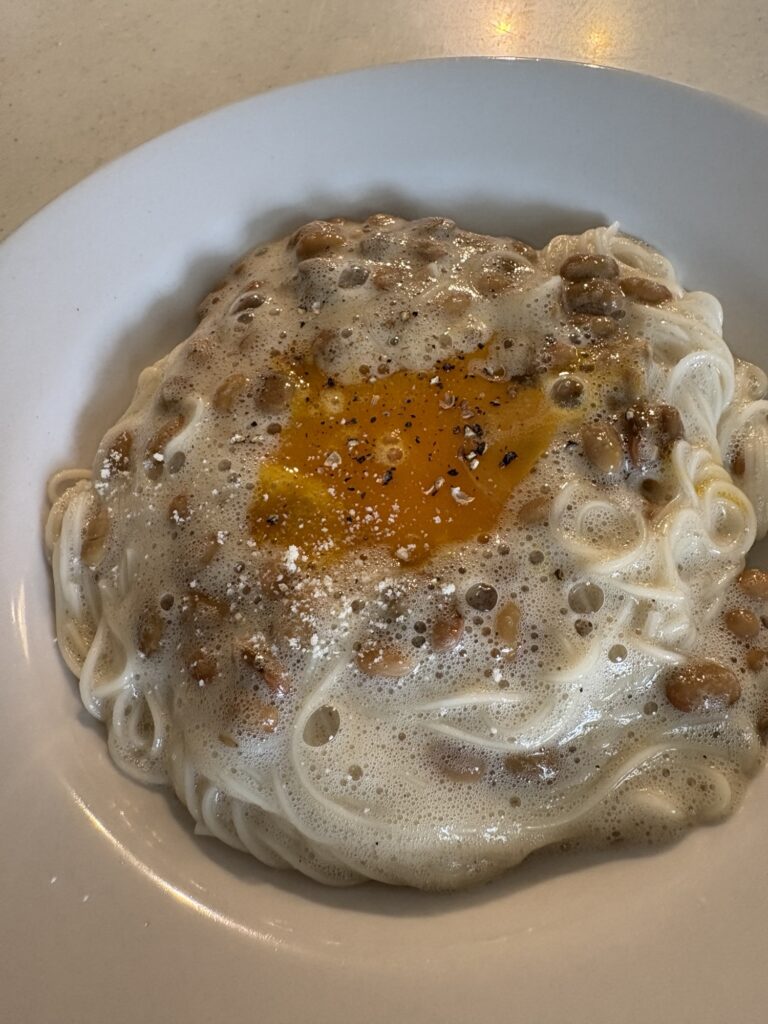SNSで見かけた「納豆カルボナーラそうめん」。